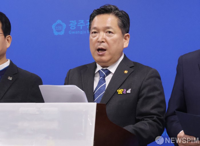 [광주=뉴스핌] 박진형 기자 = 김병내 광주 남구청장이 13일 광주시의회 브리핑룸에서 광주·전남 행정통합 관련해 구청장협의회 입장 발표 기자회견을 하고 있다. 2026.01.13 bless4ya@newspim.com