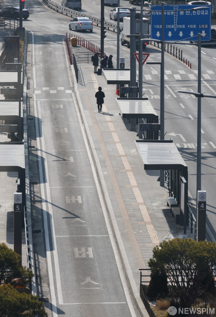 [서울=뉴스핌] 정일구 기자 = 서울 시내버스 파업이 이틀째 이어진 14일 오전 서울 중구 서울역버스종합환승센터 중앙버스전용차로가 한산한 모습을 보이고 있다. 2026.01.14 mironj19@newspim.com