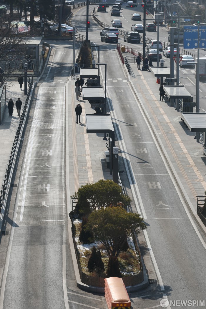 [서울=뉴스핌] 정일구 기자 = 서울 시내버스 파업이 이틀째 이어진 14일 오전 서울 중구 서울역버스종합환승센터 중앙버스전용차로가 한산한 모습을 보이고 있다. 2026.01.14 mironj19@newspim.com