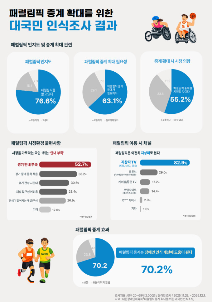 응답자의 63.1%가 '패럴림픽 중계 확대가 필요하다'고 답했으며, 중계 환경이 개선된다면 실제 시청할 의향이 있다는 응답도 55.2%로 절반을 넘었다.