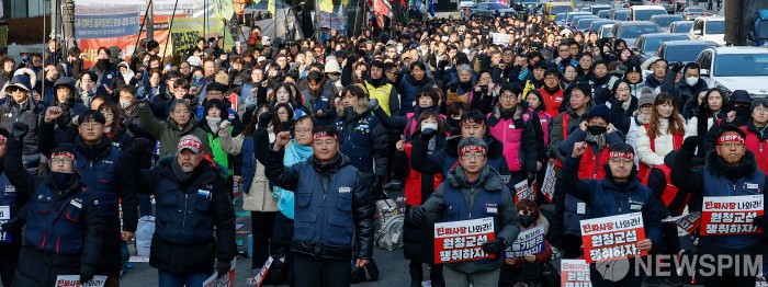 [서울=뉴스핌] 류기찬 기자 = 민주노총 조합원들이 14일 오후 서울 중구 서울지방고용노동청 앞에서 열린 2026 민주노총 신년 결의대회에서 노동 의례를 제창하고 있다. 2026.01.14 ryuchan0925@newspim.com