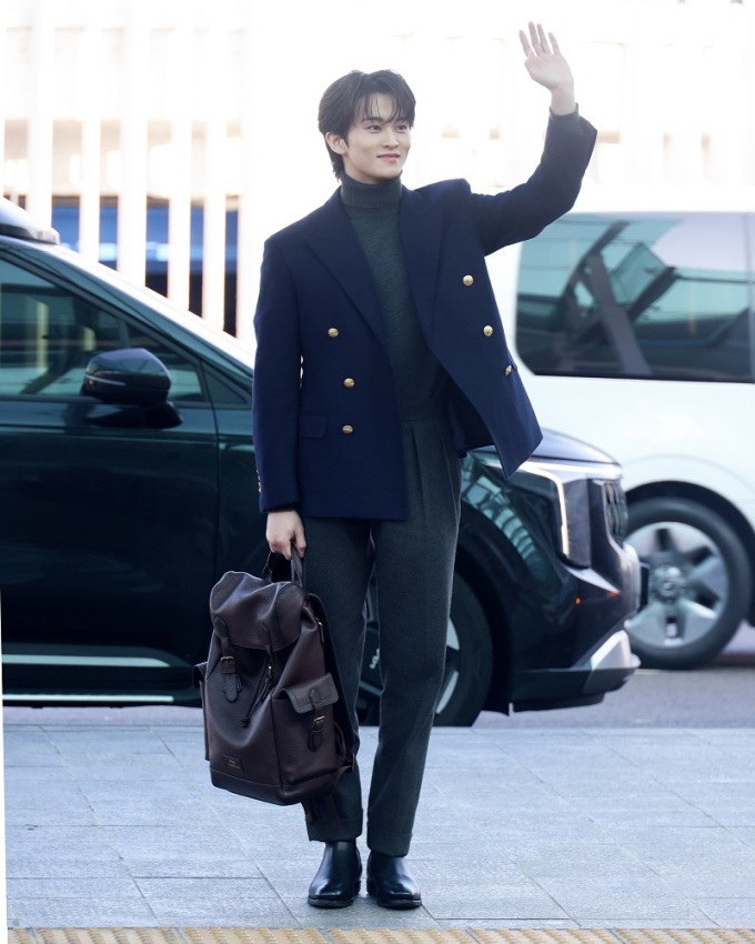 출국에 앞서 마크는 구조적인 울 플란넬 블레이저와 캐시미어 터틀넥 스웨터를 착용해 럭셔리하면서도 클래식한 무드를 연출했다. 또한, 슬림핏 트윌 팬츠와 페블 가죽 백팩을 매치해 스마트한 트래블 룩을 선보였다.