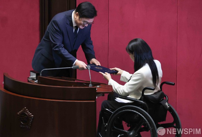 국회의장이 의장석 아래로 내려가 비례대표 승계 의원의 선서문을 직접 전달받은 건 헌정 사상 최초다. 장애인인 이 의원을 배려해 단상보다 위에 있는 국회의장석에서 직접 내려간 것은 우 의장의 평소 소신과도 일치한다는 평가다.