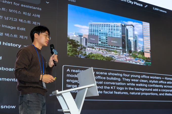 KT가 15일 서울 종로구 KT광화문빌딩WEST에서 KT디지털인재장학생들이 지난 1년 간 진행한 AI 실무 프로젝트 활동의 성과공유회를 진행했다. KT디지털인재장학생들이 지난 1년 간 진행한 AI 실무 프로젝트 활동 성과를 발표하는 모습. [사진=KT]