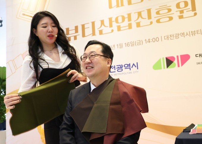 [대전=뉴스핌] 김수진 기자 = 이장우 대전시장이 16일 '대전뷰티산업진흥원' 출범식에 참석해 뷰티 전문가에게 자신의 '퍼스널컬러'를 진단받고 있다. 대전뷰티산업진흥원은 전국 최초 뷰티산업 전담기관으로 대전테크노파크 어울림플라자에서 첫 보금자리를 마련했다. 오는 2027년 도마동 신사옥으로 이전할 계획이다. [사진=이장우 시장 페이스북] nn0416@newspim.com