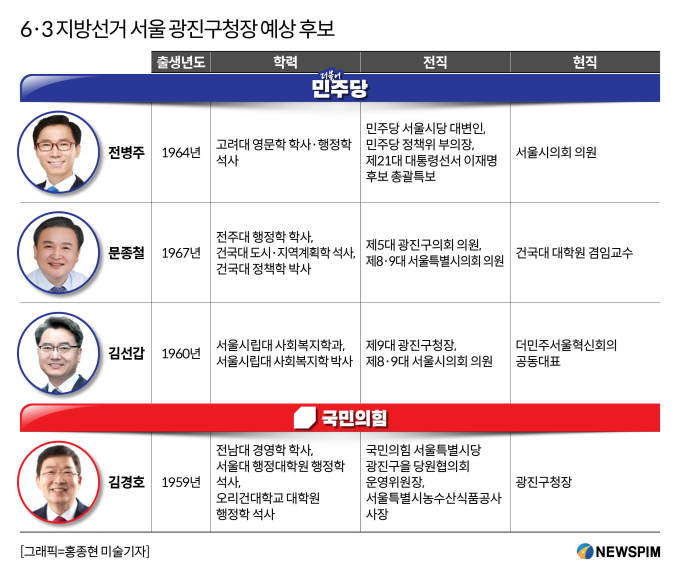민주당 내에서 이미 출마를 선언한 인물은 총 세 명이다. 김선갑 전 광진구청장을 비롯해 전병주 서울시의회 의원, 문종철 건국대 대학원 겸임 교수(전 서울시의원)가 출사표를 던졌다. 민주당 내 경선도 치열할 예정이다.