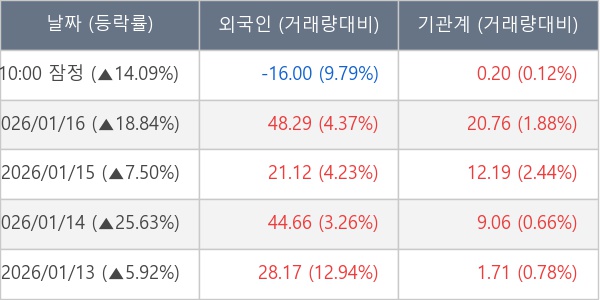 [장중수급포착] 유진로봇, 기관 17일 연속 순매수행진... 주가 +14.09%