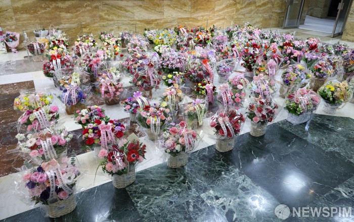 [서울=뉴스핌] 정일구 기자 = 19일 오전 서울 여의도 국회 로텐더홀에 닷새째 단식 농성을 이어가는 장동혁 국민의힘 대표를 응원하는 당원들의 꽃바구니가 놓여 있다. 2026.01.19 mironj19@newspim.com