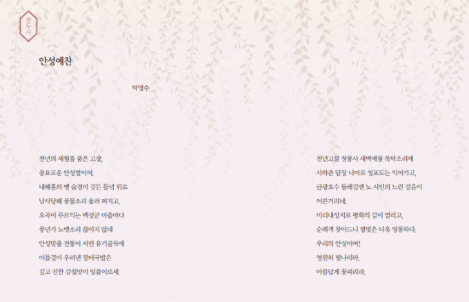 이 글은 박 의원이 직접 쓴 권두시로 안성의 역사와 자연을 노래하며 그의 뿌리 깊은 고장 사랑을 나타내고 있다.