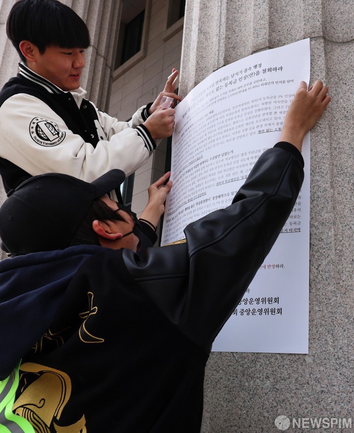 [서울=뉴스핌] 양윤모 기자 = 한국외국어대학교 총학생회 학생들이 19일 오후 서울 동대문구 이문동 한국외국어대학교 서울캠퍼스 본관 앞에서 학교 측이 제시한 3.19%의 등록금 인상안에 항의하는 대자보를 부착하고 있다. 2026.01.19 yym58@newspim.com