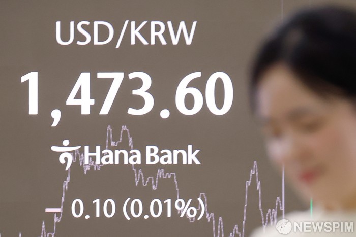 [서울=뉴스핌] 류기찬 기자 = 19일 오후 서울 중구 하나은행 딜링룸 전광판에 달러/원이 표시되고 있다. 이날 코스피 지수는 전 거래일 대비 63.92포인트(1.32%) 상승한 4904.66에, 달러/원 환율은 0.10원 오른 1473.70원에, 코스닥 지수는 13.77포인트(1.44%) 오른 968.36에 장을 마감했다. 2026.01.19 ryuchan0925@newspim.com