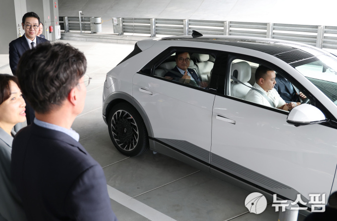 HMGICS의 백미는 단연 5층 옥상에 위치한 주행시험장 '스카이트랙'이었다. 총 길이 620m의 트랙은 갓 생산된 차량의 성능을 즉석에서 검증하는 장소다. 우 의장 일행과 취재진은 이곳에서 직접 생산된 아이오닉5를 타고 트랙을 돌았다.