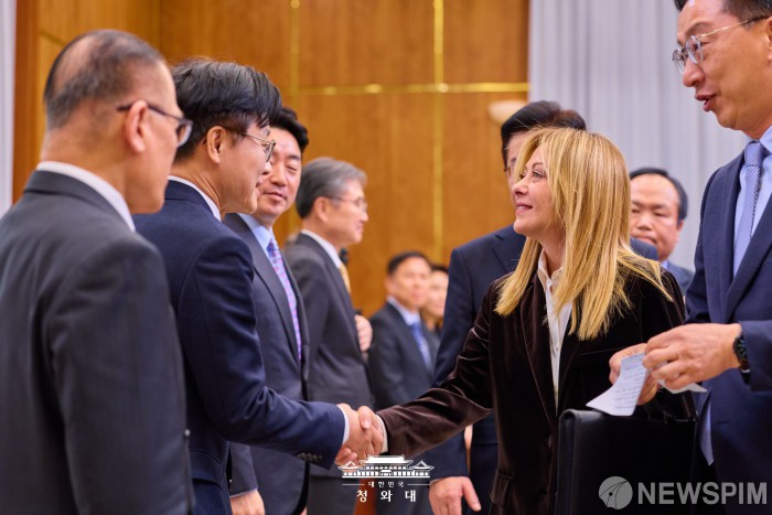 [서울=뉴스핌] 조르자 멜로니 이탈리아 총리가 지난 19일 오전 청와대에서 열린 정상회담 한-이탈리아 정상회담에서 한국 정부 관계자들과 악수를 하고 있다. [사진=청와대] 2026.01.20 photo@newspim.com