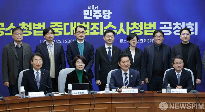 [서울=뉴스핌] 윤창빈 기자 = 정청래 더불어민주당 대표, 한병도 원내대표 등 참석자들이 20일 서울 여의도 국회에서 열린 정책의원총회 겸 공소청법-중대범죄수사청법 공청회에서 기념촬영을 하고 있다. 2026.01.20 pangbin@newspim.com