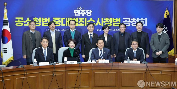 [서울=뉴스핌] 윤창빈 기자 = 정청래 더불어민주당 대표, 한병도 원내대표 등 참석자들이 20일 서울 여의도 국회에서 열린 정책의원총회 겸 공소청법-중대범죄수사청법 공청회에서 기념촬영을 하고 있다. 2026.01.20 pangbin@newspim.com