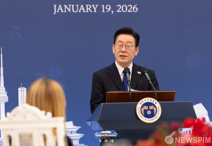 [서울=뉴스핌] 이재명 대통령이 지난 19일 청와대에서 열린 조르자 멜로니 이탈리아 총리 환영 공식 오찬에서 환영사를 하고 있다. [사진=청와대] 2026.01.20 photo@newspim.com