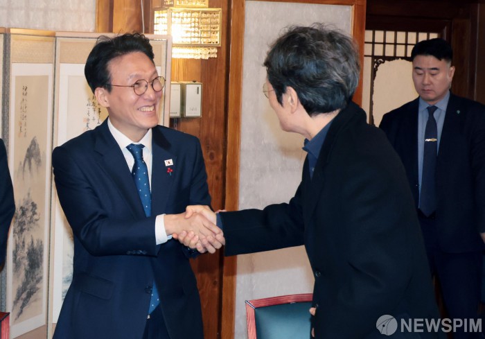 [서울=뉴스핌] 이길동 기자 = 김민석 국무총리가 20일 서울 종로구 삼청동 총리공관에서 열린 연극인 간담회에서 배우 문성근씨와 반갑게 인사하고 있다. 2026.01.20 gdlee@newspim.com