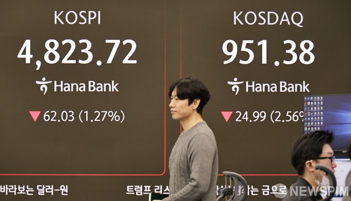 [서울=뉴스핌] 양윤모 기자 = 21일 오전 코스피가 전장 종가보다 62.03 포인트(1.27%) 하락하며 4823.72로, 코스닥은 24.99 포인트(2.56%) 하락한 951.38로 장을 시작한 가운데, 서울 중구 하나은행본점 딜링룸에서 직원들이 업무를 보고 있다. 서울외환시장에서 달러/원 환율은 전장 대비 2.40원 상승한 1480.50원에 주간거래를 시작했다. 2026.01.21 yym58@newspim.com