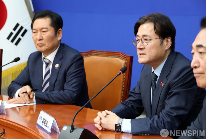 [서울=뉴스핌] 정일구 기자 = 홍익표 신임 청와대 정무수석이 21일 오후 서울 여의도 국회에서 정청래 더불어민주당 대표를 예방하며 발언하고 있다. 2026.01.21 mironj19@newspim.com