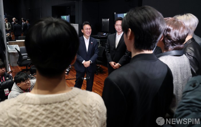 [서울=뉴스핌] 정일구 기자 = 김민석 국무총리가 21일 오후 서울 용산구 하이브 사옥 안무연습실을 방문해 보이그룹 엔하이픈과 인사를 나누고 있다. 2026.01.21 mironj19@newspim.com
