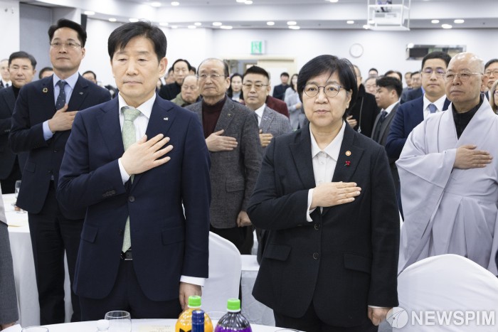 [서울=뉴스핌] 정은경 보건복지부 장관(오른쪽 두번째)이 21일 오전 서울 마포구 한국사회복지협의회에서 열린 2026년 사회복지계 신년인사회에서 국기에 대한 경례를 하고 있다. [사진=보건복지부] 2026.01.21 photo@newspim.com