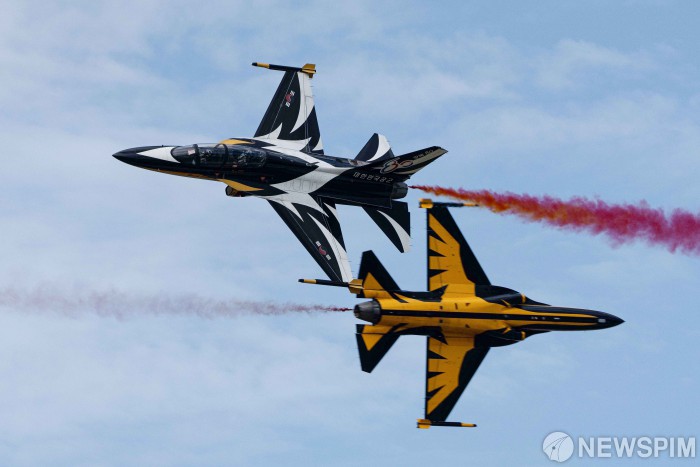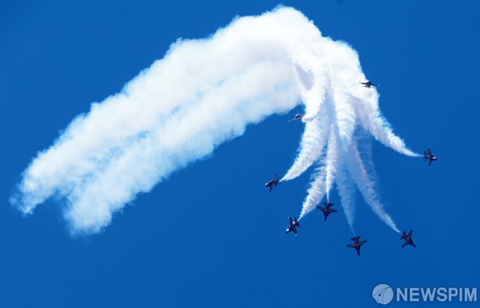 [성남=뉴스핌] 류기찬 기자 = 2025 서울 ADEX 개막일인 17일 오전 경기 성남시 서울공항에서 대한민국 공군 특수비행팀 블랙이글스가 비행을 하고 있다. 2025.10.17 ryuchan0925@newspim.com