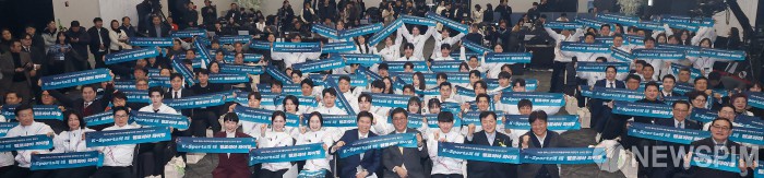 [서울=뉴스핌] 류기찬 기자 = 최휘영 문화체육관광부 장관, 유승민 대한체육회장 등 선수단들이 22일 오후 서울 송파구 올림픽파크텔에서 열린 '2026 밀라노 동계올림픽 선수단 결단식'에서 기념촬영을 하고 있다. 2026.01.22 ryuchan0925@newspim.com