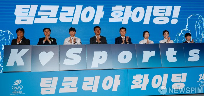[서울=뉴스핌] 류기찬 기자 = 최휘영 문화체육관광부 장관, 유승민 대한체육회장, 올림픽 선수들이 22일 오후 서울 송파구 올림픽파크텔에서 열린 '2026 밀라노 동계올림픽 선수단 결단식'에서 퍼즐 맞추기 퍼포먼스를 진행하고 있다. 2026.01.22 ryuchan0925@newspim.com