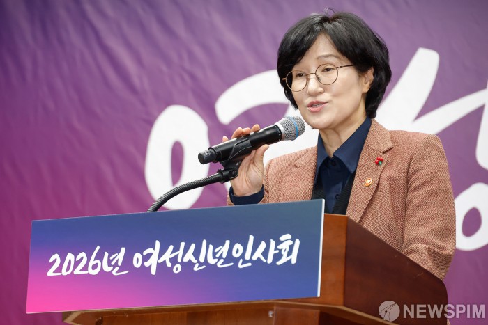 [서울=뉴스핌] 류기찬 기자 = 원민경 성평등가족부 장관이 23일 오후 서울 중구 은행회관에서 열린 2026년 여성신년인사회에서 축사를 하고 있다. 2026.01.23 ryuchan0925@newspim.com