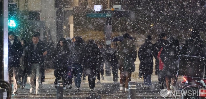 [서울=뉴스핌] 이형석 기자 = 23일 밤 서울 마포구 공덕역 인근에서 시민들이 내리는 눈을 맞으며 발걸음을 재촉하고 있다. 2026.01.23 leehs@newspim.com