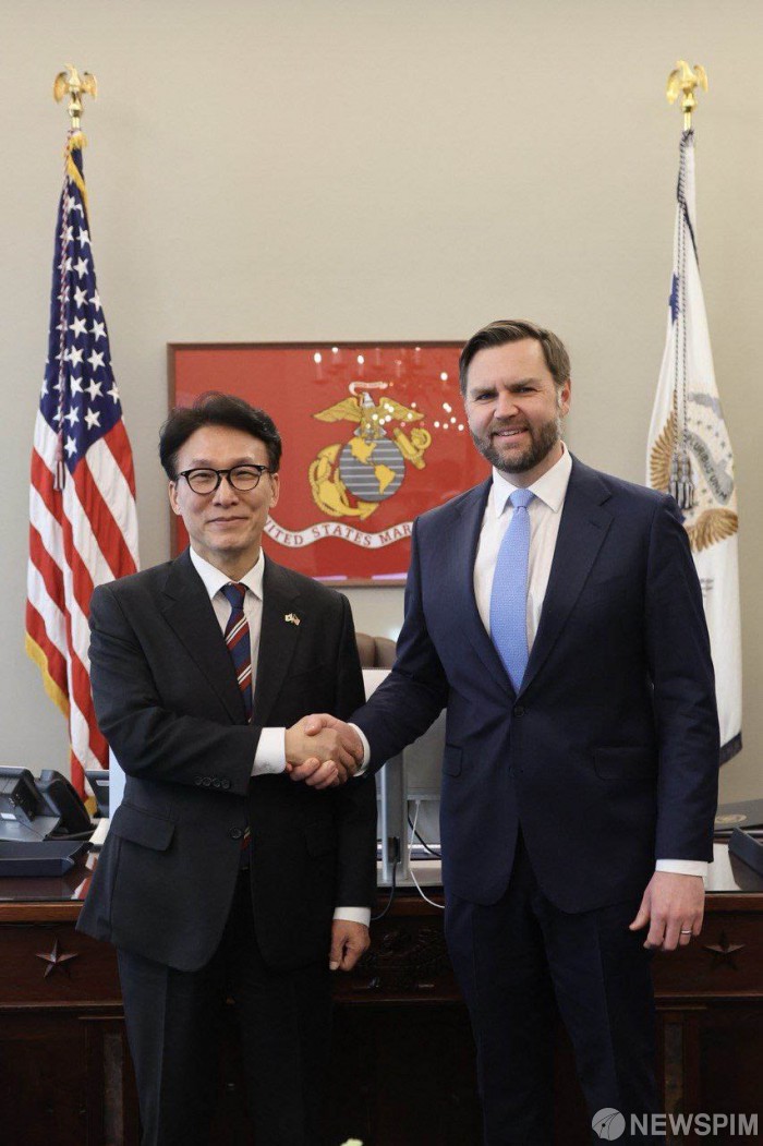 [서울=뉴스핌] 김민석 국무총리가 23일(현지 시간) 미국 워싱턴DC 백악관에서 JD 밴스 미 부통령과 면담에 앞서 기념 촬영을 하고 있다. [사진=총리실] 2026.01.24 photo@newspim.com