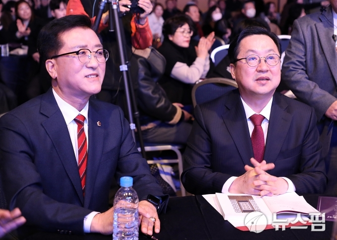 [대전=뉴스핌] 김수진 기자 = 24일 열린 '조원휘의 오직 유성' 출판기념회에서 나란히 앉은 이장우 대전시장(오른쪽)과 조원휘 대전시의장. 2026.01.24 nn0416@newspim.com