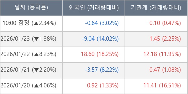[서울=뉴스핌] 로보뉴스 = 26일 10시 15분 현재 포스코퓨처엠(003670)은 전일 대비 2.34% (현재가 219,000원) 상승했고, 기관이 최근 6일 연속 순매수(누적 29.31만 주, 잠정) 행진을 하고 있다.