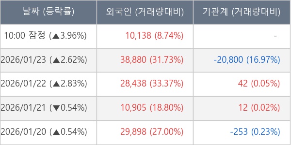 [서울=뉴스핌] 로보뉴스 = 26일 10시 15분 현재 동아엘텍(088130)은 전일 대비 3.96% (현재가 4,070원) 상승했고, 외국인이 최근 7일 연속 순매수(누적 13.74만 주, 잠정) 행진을 하고 있다.
