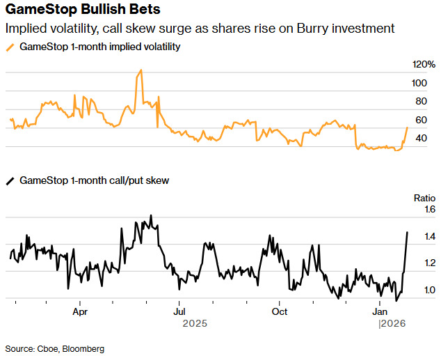 주가는 월요일 최대 8.8% 상승했다. 5월 이후 장중 최대 상승폭이었으며, 10월 8일 이후 최고치를 기록했다. 거래량도 급증했다. 옵션 트레이더들이 게임스톱 콜옵션에 몰려들면서 1개월 내재변동성이 12월 초 이후 최고치로 상승했고, 콜 스큐, 즉 약세 베팅 대비 강세 베팅의 프리미엄이 확대됐다. 월요일 전체 콜옵션 거래량은 6월 12일 이후 최고치로 증가했다.