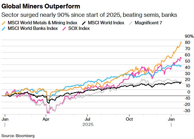 MSCI 금속·광업지수는 2025년 초 이후 거의 90% 상승하며 반도체, 글로벌 은행, 매그니피센트7으로 불리는 빅테크 주식군을 큰 폭으로 제쳤다. 로봇공학, 전기차, AI 데이터센터 붐이 금속 가격을 연이어 신고점으로 끌어올리면서 이 랠리는 멈출 기미를 보이지 않고 있다.