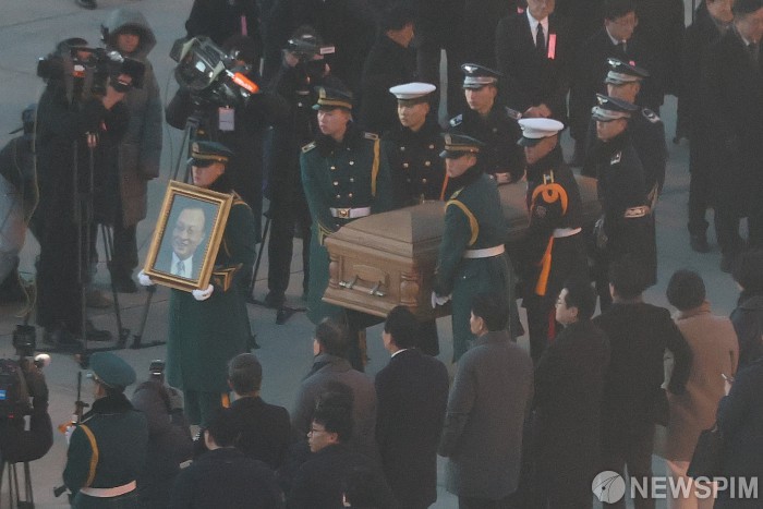 [영종도=뉴스핌] 류기찬 기자 = 고(故) 이해찬 전 국무총리(민주평화통일자문회의 수석부의장)의 시신이 27일 오전 인천국제공항 제2여객터미널에서 운구차로 옮겨지고 있다. 2026.01.27 ryuchan0925@newspim.com