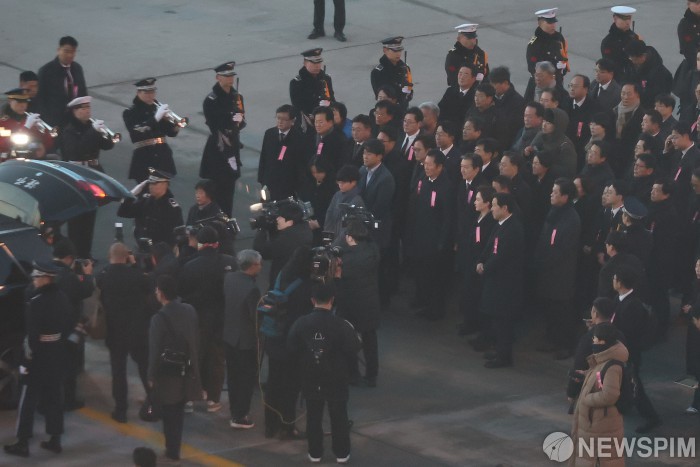 [영종도=뉴스핌] 류기찬 기자 = 우원식 국회의장, 김민석 국무총리, 정청래 더불어민주당 대표, 조국 조국혁신당 대표 등과 유가족들이 27일 오전 인천국제공항 제2여객터미널에서 고(故) 이해찬 전 국무총리(민주평화통일자문회의 수석부의장)의 시신을 모시고 있다. 2026.01.27 ryuchan0925@newspim.com