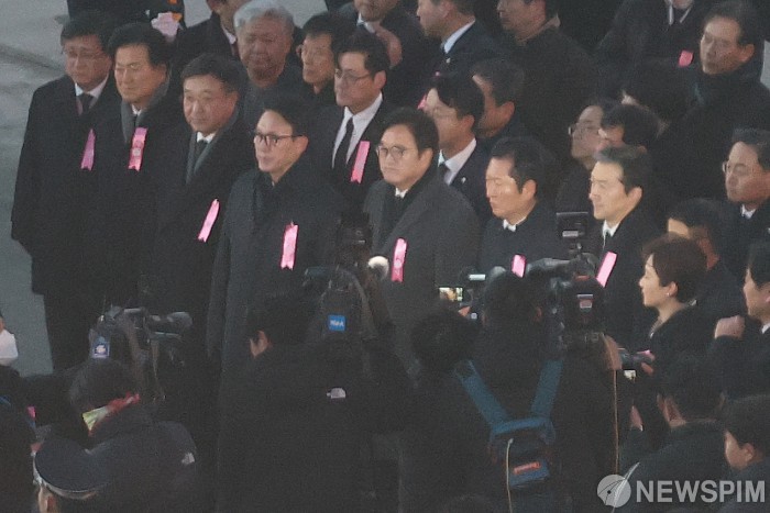 [영종도=뉴스핌] 류기찬 기자 = 우원식 국회의장, 김민석 국무총리, 정청래 더불어민주당 대표, 조국 조국혁신당 대표 등과 유가족들이 27일 오전 인천국제공항 제2여객터미널에서 고(故) 이해찬 전 국무총리(민주평화통일자문회의 수석부의장)의 시신을 모시고 있다. 2026.01.27 ryuchan0925@newspim.com