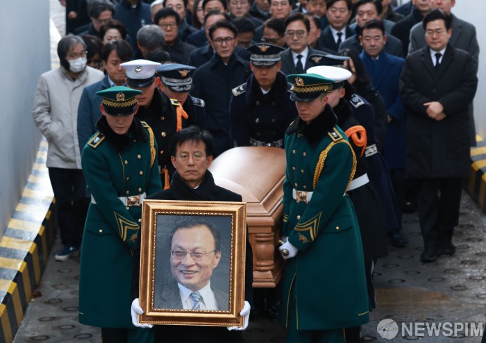 [서울=뉴스핌] 정일구 기자 = 베트남 출장 중 별세한 고(故) 이해찬 민주평화통일자문회의 수석부의장의 시신이 27일 오전 서울 종로구 서울대병원 장례식장으로 운구되고 있다. 2026.01.27 mironj19@newspim.com