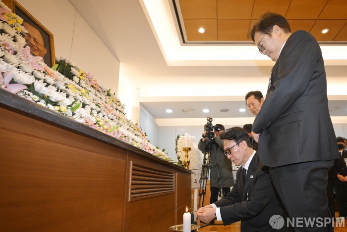 [서울=뉴스핌] 정일구 기자 = 우원식 국회의장, 김민석 국무총리, 정청래 더불어민주당 대표이 27일 오전 서울 종로구 서울대병원 장례식장에 마련된 고(故) 이해찬 민주평화통일자문회의 수석부의장의 빈소에서 조문하고 있다. 2026.01.27 mironj19@newspim.com