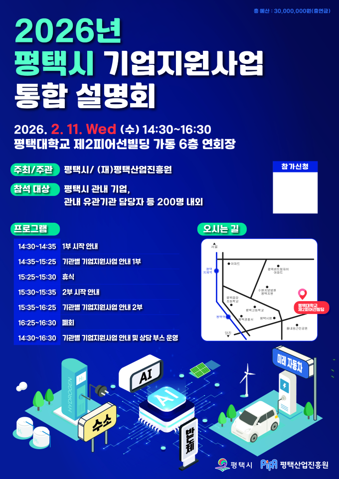 [평택=뉴스핌] 이성훈 기자 = 경기 평택시는 평택산업진흥원과 함께 내달 11일 평택대학교 제2피어선빌딩 6층 대강당에서 '평택 중소기업 지원사업 설명회'를 개최한다고 27일 밝혔다.