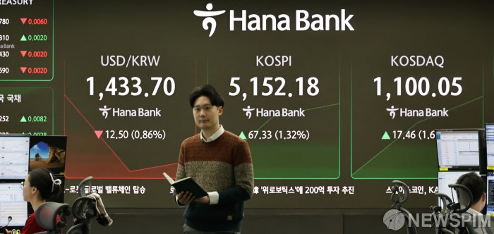 [서울=뉴스핌] 양윤모 기자 = 28일 오전 코스피가 전장 종가보다 67.33 포인트(1.32%) 상승하며 5152.18로, 코스닥은 17.46포인트(1.60%) 상승한 1100.05로 장을 시작한 가운데, 서울 중구 하나은행본점 딜링룸에서 직원들이 업무를 보고 있다. 서울외환시장에서 달러/원 환율은 전장 대비 12.50원 하락한 1433.70원에 주간거래를 시작했다. 2026.01.28 yym58@newspim.com