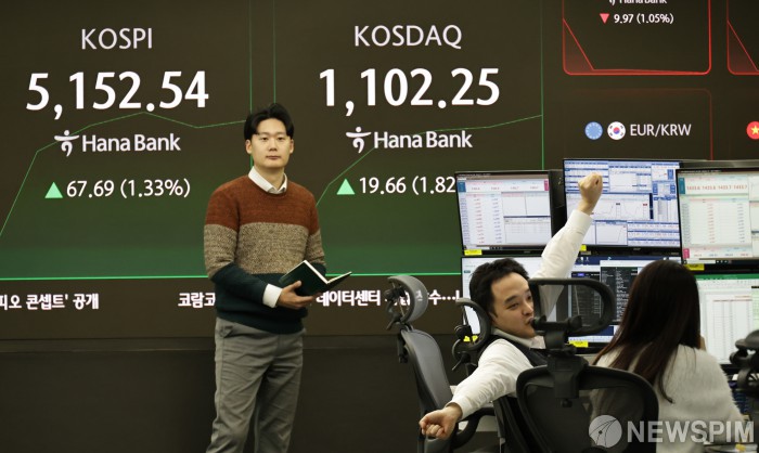 [서울=뉴스핌] 양윤모 기자 = 28일 오전 코스피가 전장 종가보다 67.69 포인트(1.33%) 상승하며 5152.54로, 코스닥은 19.66포인트(1.82%) 상승한 1102.25로 장을 시작한 가운데, 서울 중구 하나은행본점 딜링룸에서 직원들이 업무를 보고 있다. 서울외환시장에서 달러/원 환율은 전장 대비 12.50원 하락한 1433.70원에 주간거래를 시작했다. 2026.01.28 yym58@newspim.com