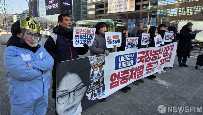 [서울=뉴스핌] 양윤모 기자 = 윤석열 전 대통령 부인 김건희 씨에 대한 1심 선고가 28일 오후 서울중앙지법 27 형사부(부장판사 우인성)에서 예정된 가운데, 전국민중행동 회원들이 서울 광화문광장 이순신 장군 동상 앞에서 '국정농단 김건희 엄중처벌 촉구 기자회견'을 하고 있다. 2026.01.28 yym58@newspim.com