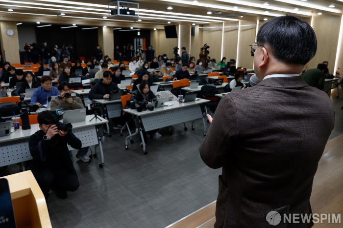 [서울=뉴스핌] 류기찬 기자 = 민희진 전 어도어 대표 측 법률대리인 법무법인 지암 김선웅 변호사가 28일 오후 서울 종로구 교원스페이스 챌린지홀에서 열린 ‘뉴진스 탬퍼링’ 의혹에 관한 기자회견에서 발언을 하고 있다. 2026.01.28 ryuchan0925@newspim.com