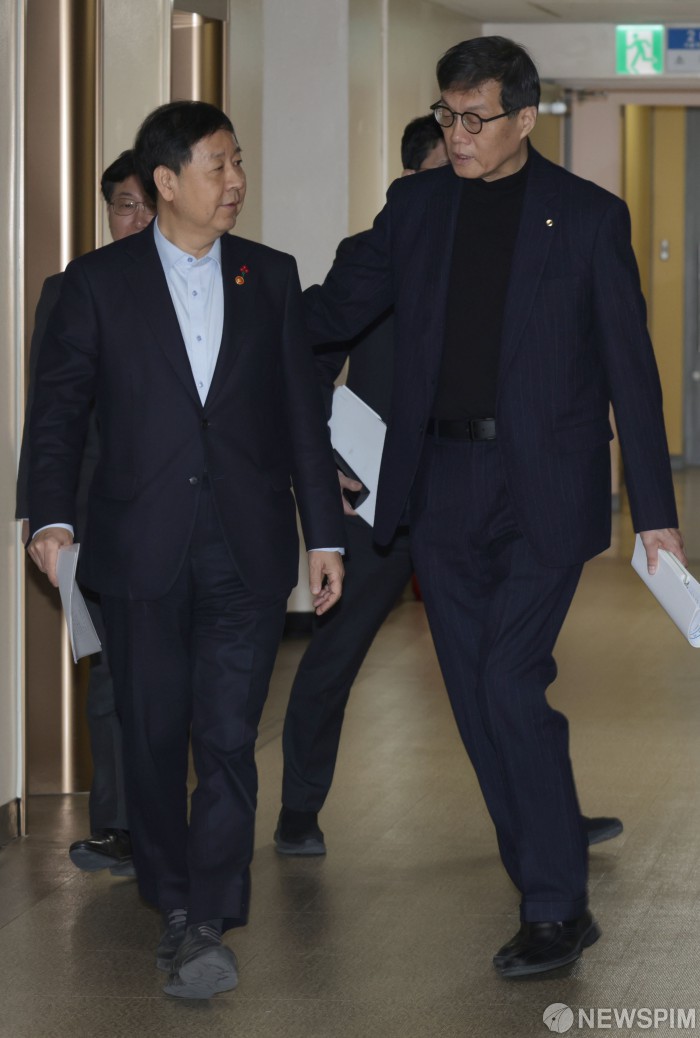 [서울=뉴스핌] 이길동 기자 =구윤철 부총리 겸 기획재정부 장관과 이창용 한국은행 총재가 29일 서울 종로구 정부서울청사에서 열린 확대 거시경제금융회의에 참석하며 대화를 하고 있다. 2026.01.29. gdlee@newspim.com