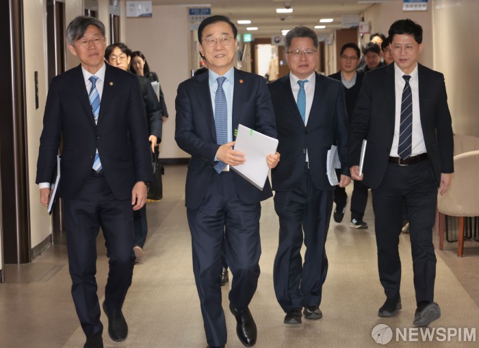 [서울=뉴스핌] 이길동 기자 = 김윤덕 국토교통부 장관이 29일 서울 종로구 정부서울청사에서 도심 주택공급 확대 및 신속화 방안 발표를 위해 브리핑룸에 들어서고 있다.2026.01.29. gdlee@newspim.com