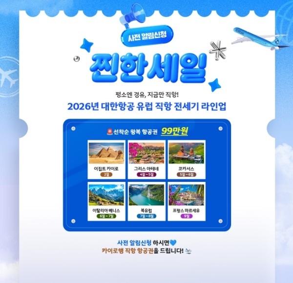 가장 눈길을 끄는 것은 이집트 카이로, 그리스 아테네, 코카서스, 이탈리아 베니스, 북유럽, 프랑스 마르세유를 아우르는 항공권 특가다. 평소 한 번에 가기 어려웠던 유럽 지역을 대한항공 직항 전세기 특가 항공권으로 90만 원대의 합리적인 가격에 부담 없이 즐길 수 있다. 더불어 지역별 판매석이 4석에서 16석 사이로 한정되어 있어 원하는 목적지의 항공권을 선점하기 위한 여행객들의 치열한 예약 경쟁이 예상된다.
