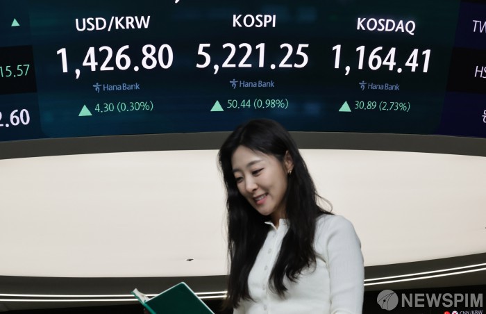 [서울=뉴스핌] 양윤모 기자 = 美연준이 금리를 3연속 인하 후 동결한 29일 오후 코스피가 전장 종가보다 50.44 포인트(0.98%) 상승하며 5221.25로, 코스닥은 30.89 포인트(2.73%) 상승한 1164.41로 장을 마감한 가운데, 서울 중구 하나은행본점 딜링룸에서 직원들이 업무를 보고 있다. 서울외환시장에서 달러/원 환율은 전장 대비 4.30원 상승한 1426.80원에 주간거래를 마감했다. 2026.01.29 yym58@newspim.com